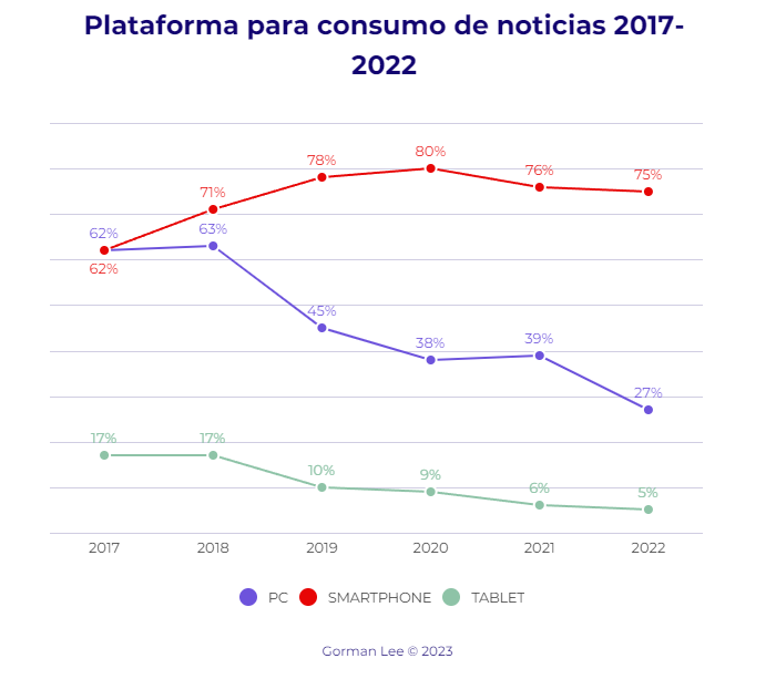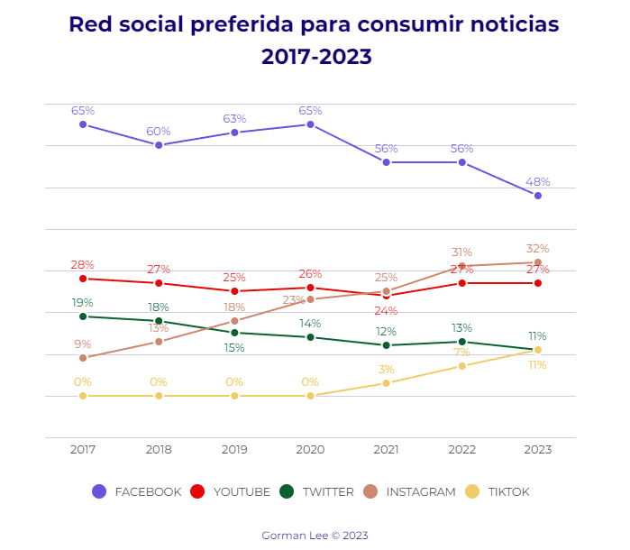 Como medio para consumir noticias, Facebook sigue siendo amo y señor entre las redes sociales. Sin embargo, 2023 representa su porcentaje más bajo (48%), aunque todavía a mucha distancia del segundo, que es Instagram. Si exceptuamos TikTok, que entró en la vida de los argentinos recién en 2020, Instagram tuvo el crecimiento más grande para cualquier red social analizada, pasando de representar el 9% como opción en 2017, al 32% este año. Contrariamente a lo que cabría imaginar, el crecimiento de TikTok es constante aunque lento: pasó del 3% en 2021 al 11% actual, porcentaje en el que converge este año con Twitter, en declive como opción para estar informado desde 2017. A pesar de ello, y de acuerdo a Mitchelstein y Boczkowskiel, el consumo de noticias por redes sociales está cayendo de manera generalizada: menos de la mitad reconoce haber leído noticias en Facebook la última semana y sólo tres de cada diez dice haber accedido a ellas por Instagram o YouTube.