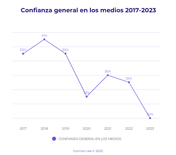 Como señalamos antes, el papel como fuente de noticias en Argentina sigue su natural declinación: pasó del 45% en 2017 a sólo 15% en 2023. Esto se ve reflejado en las tiradas dominicales, que en el caso de Clarín, la más importante, se redujo de 200.000 a 150.000 en un año. Pero los datos muestran también una caída tanto en la TV como en los medios online y las redes sociales como soporte elegido para informarse. Al igual que el diario en papel, la televisión también fue perdiendo terreno todos estos años, de un importante 81% en 2017 al 57% actual (el año pasado la tele vivió un breve idilio con su audiencia a raíz del Mundial). Incluso soportes que parecían tener un futuro promisorio por delante, como las redes sociales, no han sabido encajar bien el golpe del desinterés generalizado, a pesar de que en años anteriores habían experimentado cierto crecimiento.