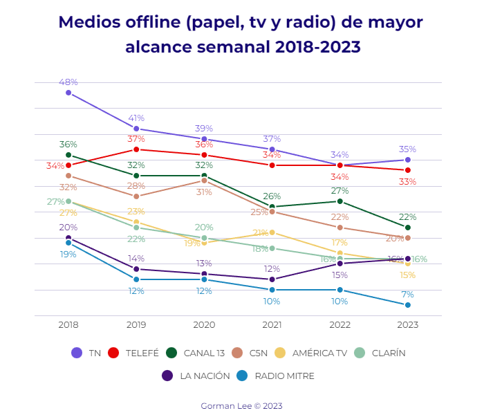 Por “alcance semanal” Reuters Institute entiende al porcentaje de la audiencia encuestada que consume un medio determinado todos los días de la semana (un ítem que comenzó a medir en 2018). El 35% de los encuestados este año elige a la señal de cable del Grupo Clarín como su fuente semanal de noticias offline (diario, TV o radio), un punto por encima de Telefé (cabe señalar que la diferencia entre ambos en 2018 era bastante holgada y representaba 14 puntos a favor del primero). Por otro lado, aunque varios medios offline han caído progresivamente en su audiencia de alcance semanal desde 2018 (es el caso de Clarín, que pasó de 27 a 16%, o de Canal 13, que cayó de 36 a 22%), sorprende el caso de Radio Mitre, cuya audiencia semanal pasó en seis años del 19 al 6%.