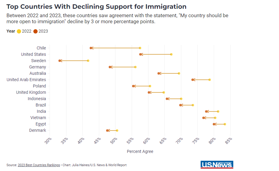 Ante la pregunta “Mi país debería ser más abierto a la inmigración”, el 42,51% de los chilenos se manifestó de acuerdo este año, contra el 57,49% que lo hacía un año atrás, en 2022. Los casi 15 puntos de caída anual que registra Chile en la aprobación de la inmigración representan la brecha más alta entre los 36 países encuestados en el análisis anual de percepciones globales de US News. El resto de países con mayor crecimiento al rechazo a la inmigración para el mismo periodo son Estados Unidos (9,42%), Suecia (8,67%), Alemania (7,76%), Australia (6,19%), Emiratos Árabes Unidos (5,19%), Polonia (5,09%), Reino Unido (4,51%), Indonesia (4,33%) y Brasil (3,79%).
